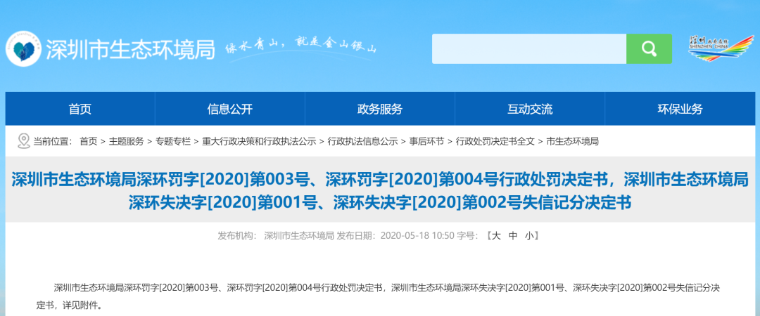 2020年5月15日—18日,深圳市生態環境局作出《深環罰字[2020]第001號》、《深環罰字[2020]第002號》,《深環罰字[2020]第003號》、《深環罰字[2020]第004號》、《深環失決字[2020]第001號》、《深環失決字[2020]第002號》。