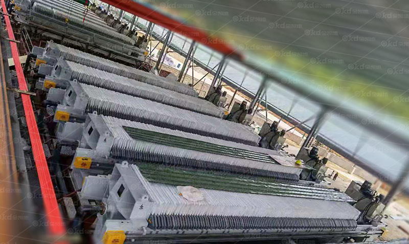 選礦廠生產的尾礦漿經高效濃密機濃縮後,由渣漿泵送至壓濾車間攪拌和壓濾。充分擠壓後形成片狀尾砂餅。尾礦濾餅采用皮帶機運輸,分層存放在幹尾礦堆場。